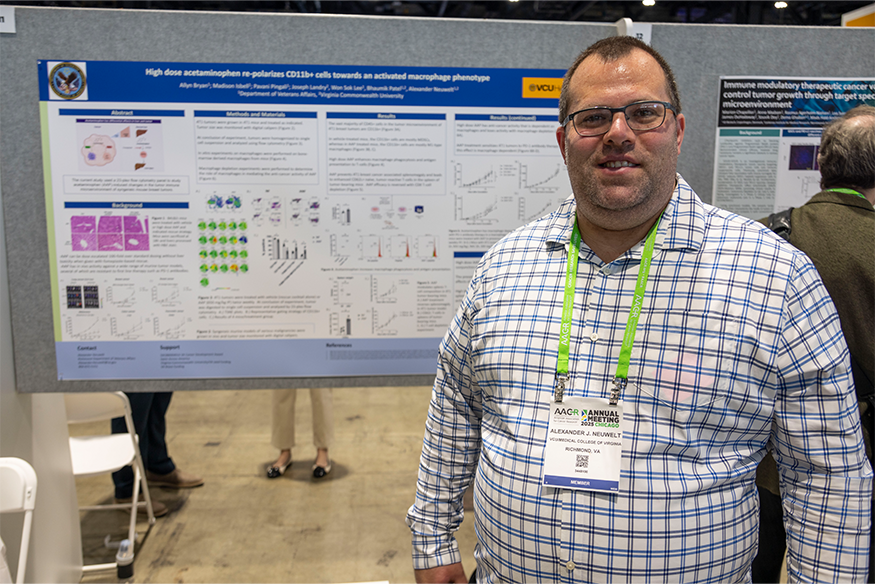 Alexander Neuwelt, M.D., a Massey research member who has been attending the AACR annual conference since he was in high school, presented his research findings investigating how high-dose acetaminophen re-polarizes CD11b+ cells toward an activated macrophage phenotype. This study is the first-of-its-kind to comprehensively evaluate the effects of acetaminophen on the tumor microenvironment, and future clinical trials are planned to further this research.