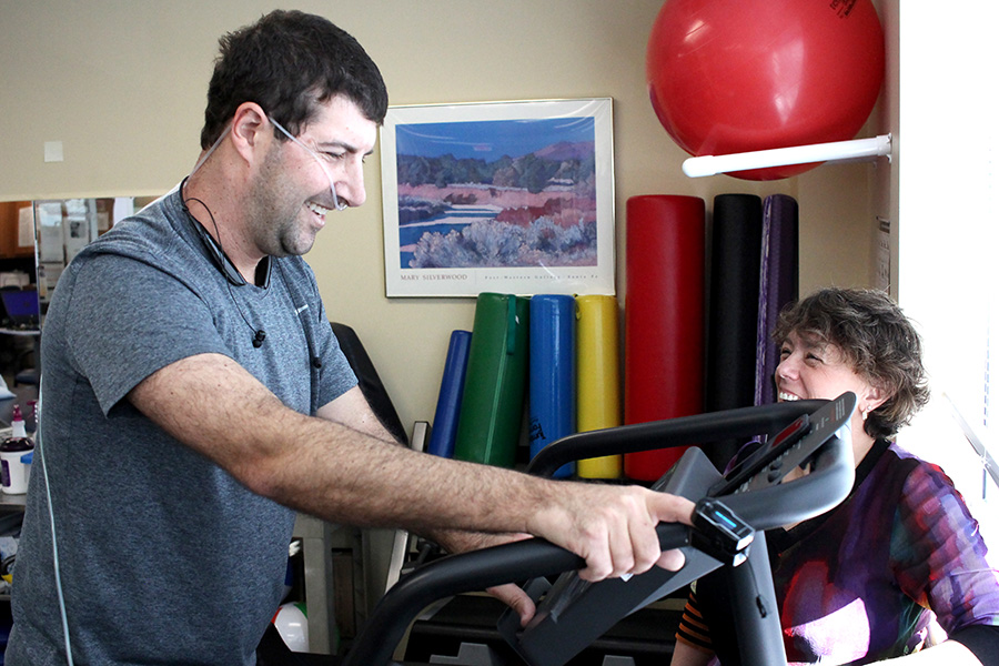 On the treadmill about 20 feet away from Shell, Josh Rubinstein works through a routine that includes cardio, weights and exercises designed to strengthen the core of his body. Five years ago, Rubinstein underwent a bone marrow transplant for acute leukemia. A degenerative lung condition present prior to transplantation necessitates the use of oxygen, but he is now back to doing the activities that he loves like playing golf and keeping up with his two active daughters. In fact, he recently returned from Jackson Hole, WY, where he went skiing for the first time in 20 years.“I’ve been in physical therapy for about four years now, and we are constantly changing my routine to make sure I continue to progress,” said Rubinstein. “I have my limits, but I can do a lot more than I used to—when I first started I couldn’t even walk up stairs.”