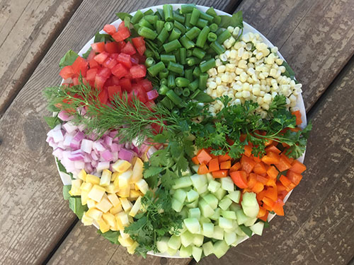 Eating the colors of the rainbow is easy with this recipe. Follow the recipe as written, or substitute your favorite veggies. Some vegetables, like the green beans and corn, are more enjoyable when blanched. Boil for 2 minutes, then stop the cooking by placing in an ice bath. The result is brightly colored veggies with a nice crunch!